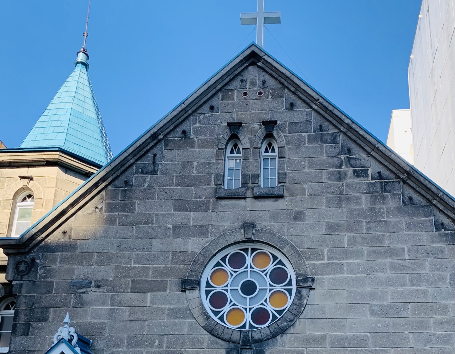 印象的な丸窓は、バラ窓と呼ばれる円形のステンドグラス